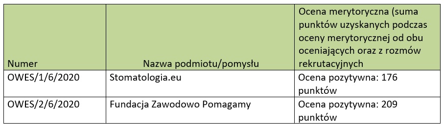 Tym razem Komisja Rekrutacyjna oceniała biznesowe plany Fundacji Zawodowo Pomagamy oraz koncept pn. Stomatologia.eu. Pierwszy wniosek dotyczył rozszerzenia działalności restauracji „Manufaktura Smakowitości” i utworzenia małej piekarni, drugi stworzenia portalu reklamowego dla gabinetów i klinik stomatologicznych. Teraz czas na dopracowanie pomysłów i złożenie biznesplanu z wnioskiem o dotację na tworzenie miejsc pracy i udzielenie wsparcia pomostowego.